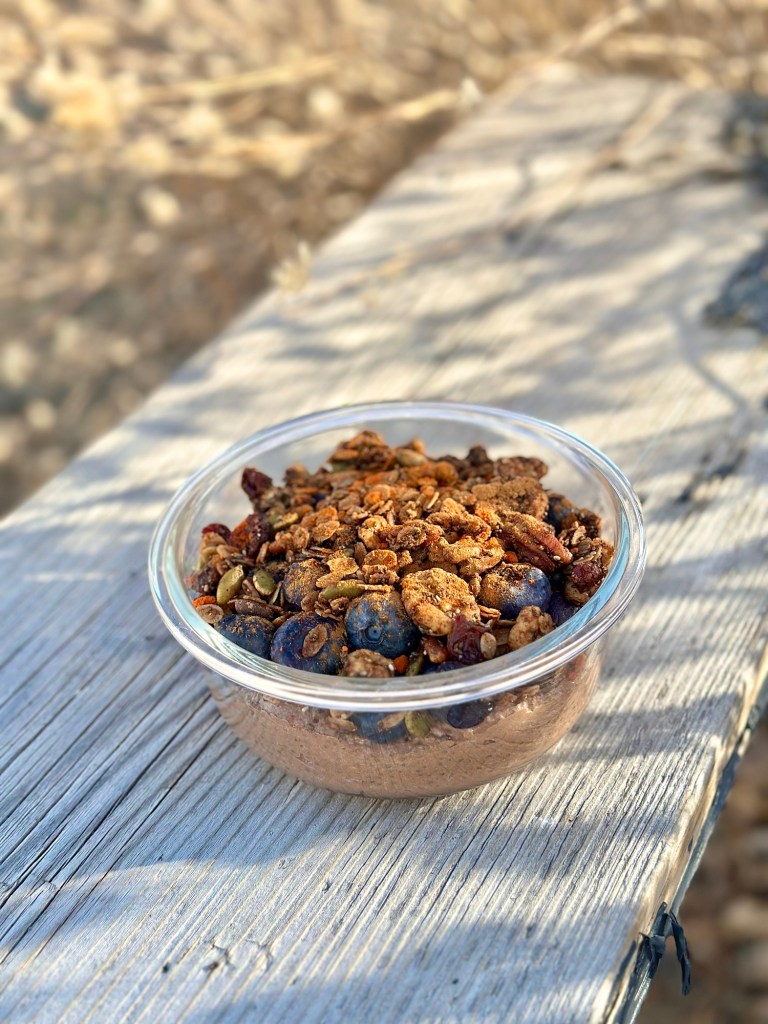 Add all the ingredients for the granola to a bowl and mix well. Place on a sheet pan with parchment paper. Bake at 350 for 20-25 minutes. After the granola has cooled add in 1/4 chocolate chips and 1/4 cup cranberries. Top the chia pudding with fresh berries, cinnamon and cayenne pepper.